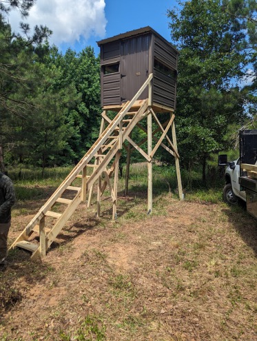 We most commonly offer a 8' or 4' tower kit for our customers. We pre-build 2 sides of the tower with a slight cant for stability with x bracing, as well as provide the extra material needed for the remaining x bracing upon assembly. We use all pressure treated material and galvanized fastening. Our staircases are prebuilt to fit the heights of the towers and make getting in/out of your Rutt Hutt easy and safe.